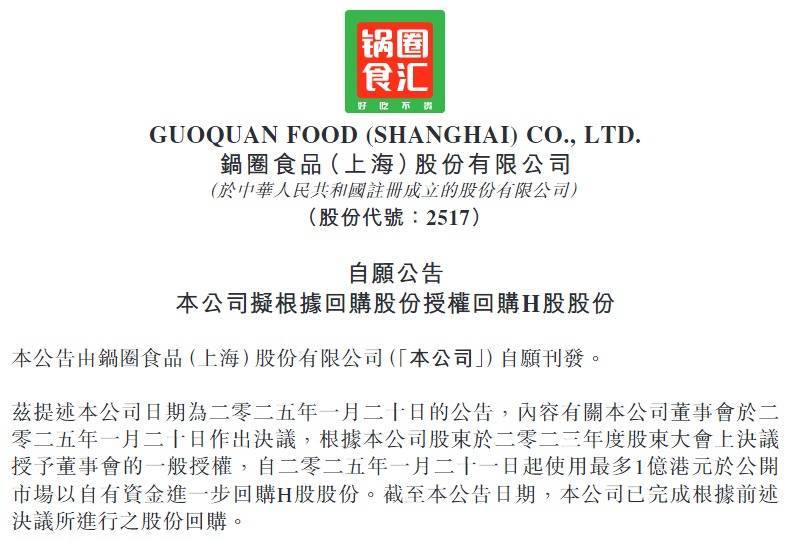 近日,锅圈(02517.HK)发布公告称,董事会决议自2025年9月26日起至回购股份授权到期之日止,拟动用最多1亿港元自有资金在公开市场回购股份,回购价溢价不超过前五日均价5%,回购的股份可能会被注销或持作库存股。根据公告,董事会认为当前股价并未充分反映公司的内在价值及业务前景,因此通过回购股份彰显对公司发展及增长潜力的信心。